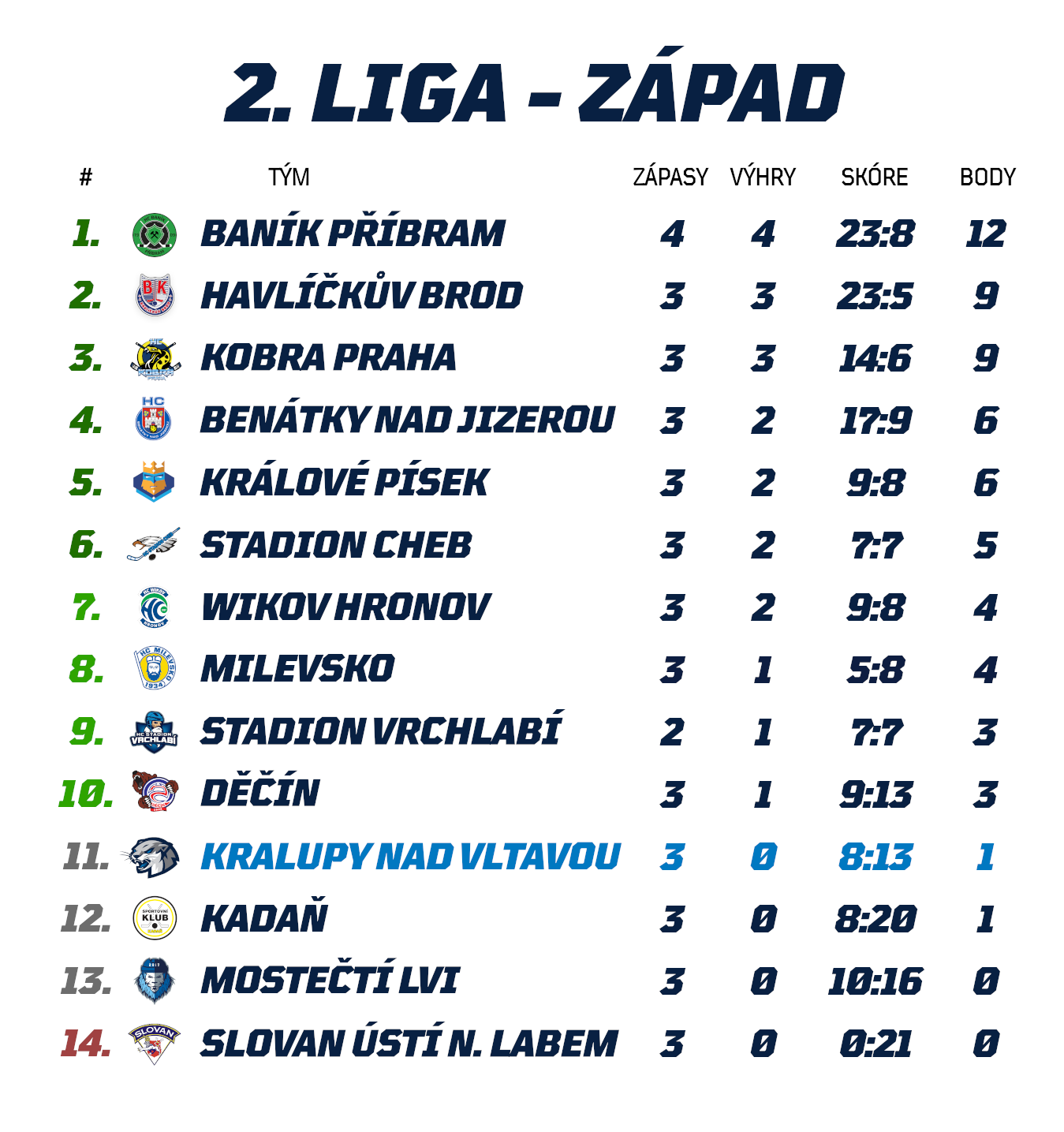 Přestože se sedmibodový nejproduktivnější muž Havlíčkova Brodu Lukáš Endál nechal v rozhovoru pro nový web ADKLH slyšet, že po přesunu z východní skupiny bruslaři nemají představu o stylech hry soupeřů a jsou pro ně tak velkou neznámou, daří se Brodu s tímto "hendikepem" zatím popasovat na výbornou. Po prvních třech zářijových kolech mají Havlíčkobrodští na kontě plný počet bodů a nebýt středeční předehrávky 7. kola Příbrami s Chebem, okupovali by se skóre 23:5 suverénně první příčku západní skupiny. Pomohli si k tomu nejprve úspěšným prvním kolem, kdy na domácím ledě vyprovodili 4:1 Mostecké Lvy, načež následovala jedenáctigólová demolice ústeckého Slovanu a pohodlná výhra 8:4 nad Kadaní.