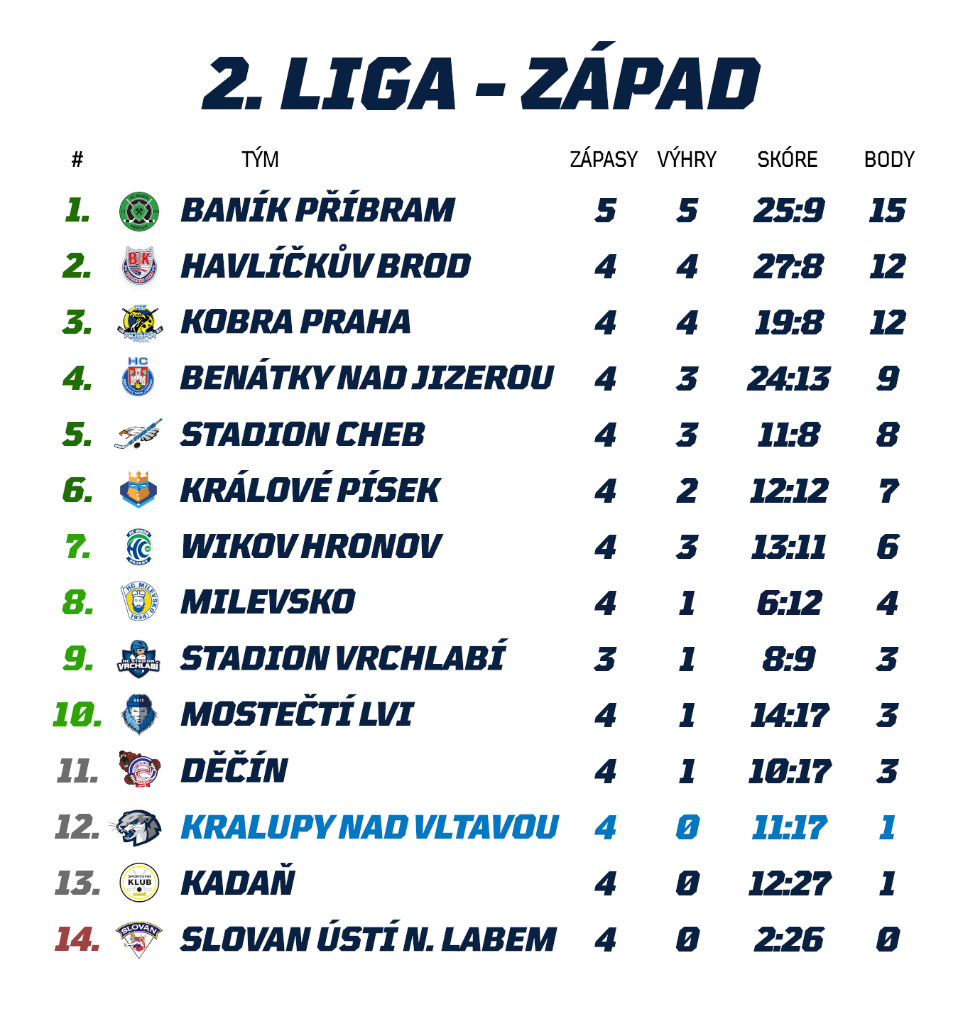Kralupský A-tým zatím doplácí na nedisciplinovanost a neproměněné šance z úvodního utkání v Písku, kde i přesto, že nebyl horším týmem na ledě, si nedokázal poradit se skvěle chytajícím Oliverem Šatným a odvezl si porážku 1:2. Po následném bodě získaném za domácí prohru v prodloužení proti Hronovu pak čelil dvěma předním týmům tabulky z Příbrami a Havlíčkova Brodu, s nimiž sehrál vyrovnaná utkání, do vítězné tečky je však dovézt nedokázal. O první výhru se tak pokusí ve středu na horkém ledě Benátek nad Jizerou.