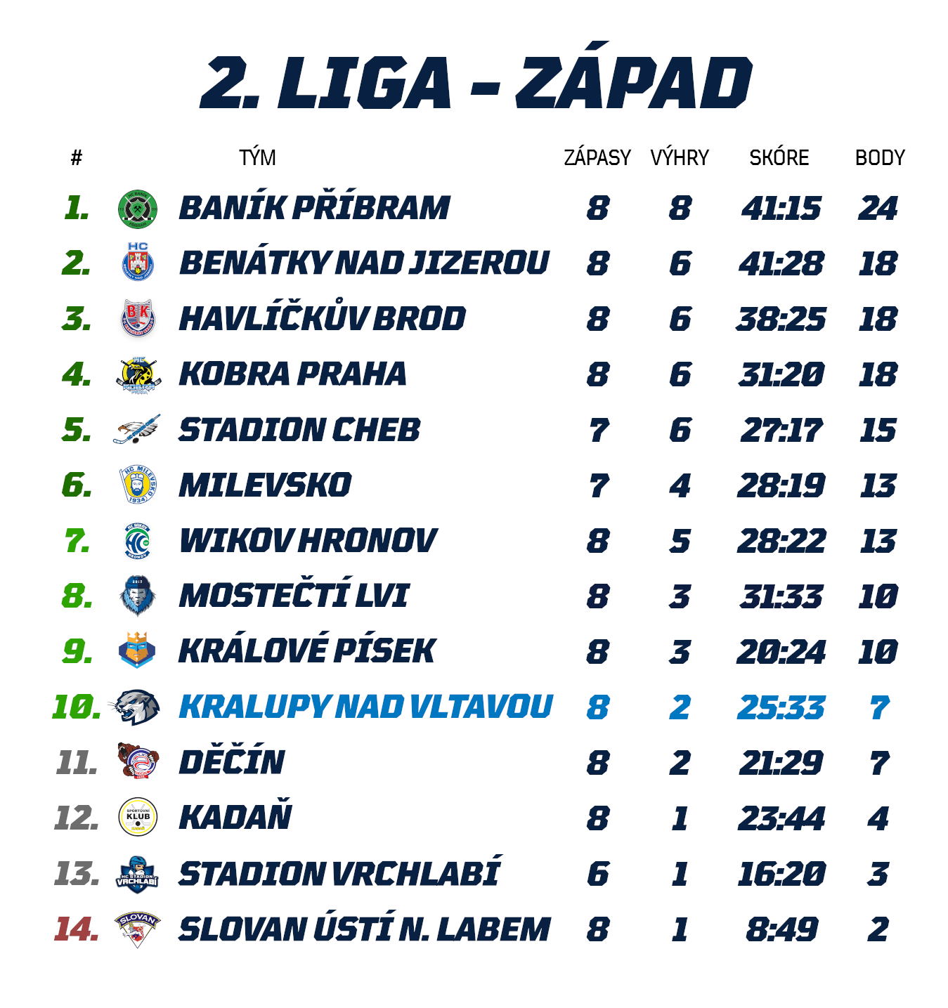 Mostečtí Lvi do letošní sezóny nevstoupili vůbec dobře a během září se jim nepodařilo ani jednou bodovat, když v prvních kolech utrpěli postupně porážky 1:4 v Havlíčkově Brodě, 5:7 s Benátkami a 4:5 na Kobře. Snad to bylo i poměrně těžkým losem na start soutěže, kdy je nutno vzít v potaz, že padli se třemi z top 4 týmů západní tabulky, říjen už byl oproti tomu totiž jiné kafe. Za pět dosavadních říjnových utkání Most nebodoval pouze jedinkrát a to v posledním sobotním kole v Kadani, kde po bezgólové první třetině domácí překlopili momentum na svou stranu a Mostecké převálcovali v celkovém součtu 4:1. Před tímto zápasem však Most dokázal porazit stejným poměrem silné Milevsko, uspět 4:3 v Děčíně, připsat si bod za divokou porážku 7:8 po prodloužení v Chebu a roznést 5:1 Ústí nad Labem.