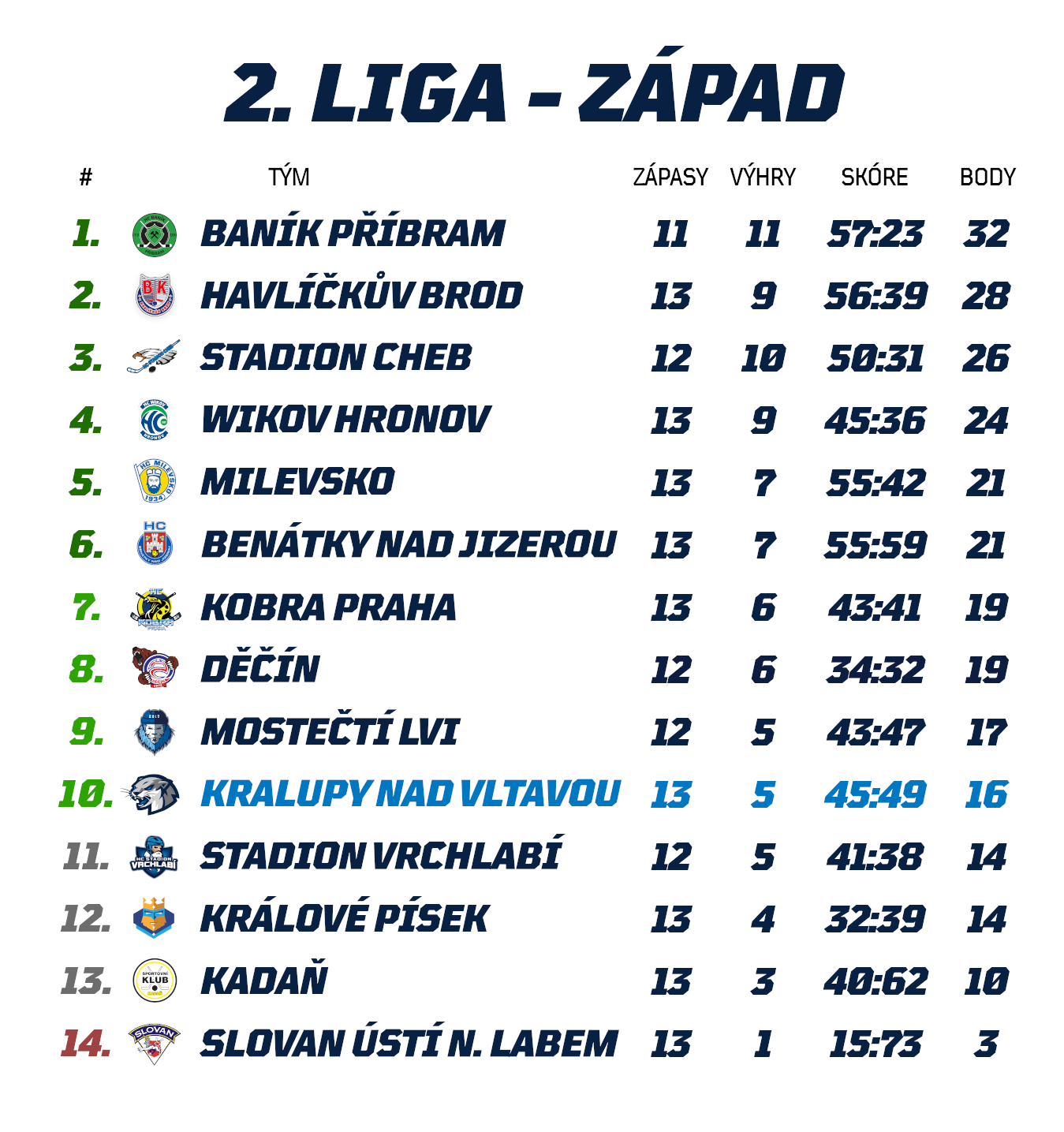 Dnes už je nálada v obou kabinách jistě trochu odlišná. Písek totiž v následujících 11 kolech dokázal vyhrát pouze dvakrát, a to 3:1 nad Kobrou a 4:1 s Ústím nad Labem. Zdviženým prstem pro svěřence trenérské dvojice Švagrovský - Antončík by však přesto mělo být velké množství velice těsných porážek Králů, kteří s Chebem, Havlíčkovým Brodem, Děčínem či Mostem prohráli jen o jedinou branku, přičemž se silným Hronovem a v Milevsku padli dokonce až po samostatných nájezdech. Proti Písku tak ve středu Kralupáky rozhodně nečeká snadná mise, a to i přesto, že budou útočit již na svou pátou domácí výhru v řadě.