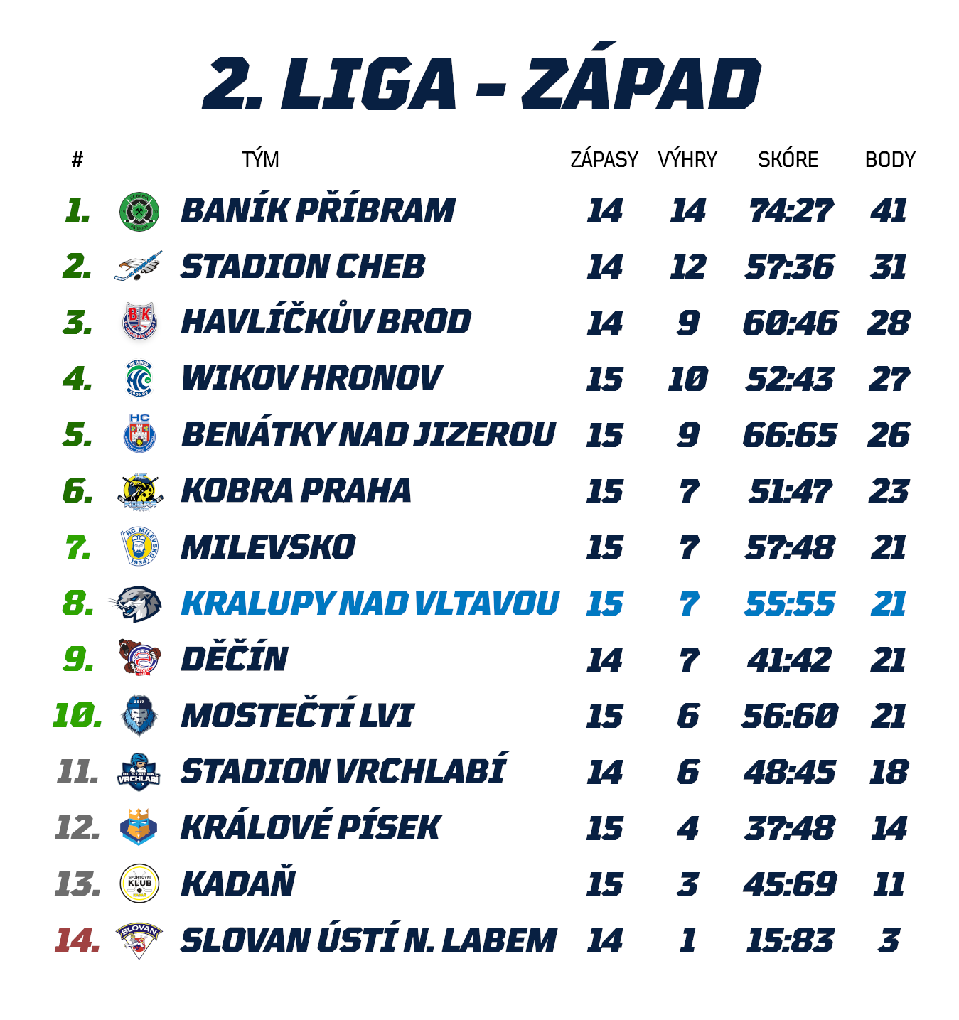 Odvetná bitva v Kralupech slibuje atraktivní podívanou. Proti útoku Příbrami na jejich 15. výhru v řadě se postaví rovněž na vítězné vlně se nesoucí kralupský celek, který z posledních deseti zápasů vybojoval sedm vítězství a do středečního utkání bude vstupovat s třízápasovou vítěznou šňůrou v zádech, když uspěl 7:3 nad Vrchlabím, 6:3 nad Pískem a naposledy přivezl cenné dvoubodové vítězství po úspěšných nájezdech v dalekém Hronově. Obzvláště se pak svěřencům Švagrovského s Antončíkem daří v domácím prostředí, kde před kralupským publikem padli naposledy 4. října v poměru 3:4 s Havlíčkovým Brodem, načež Kralupští vybojovali pět domácích vítězství v řadě.