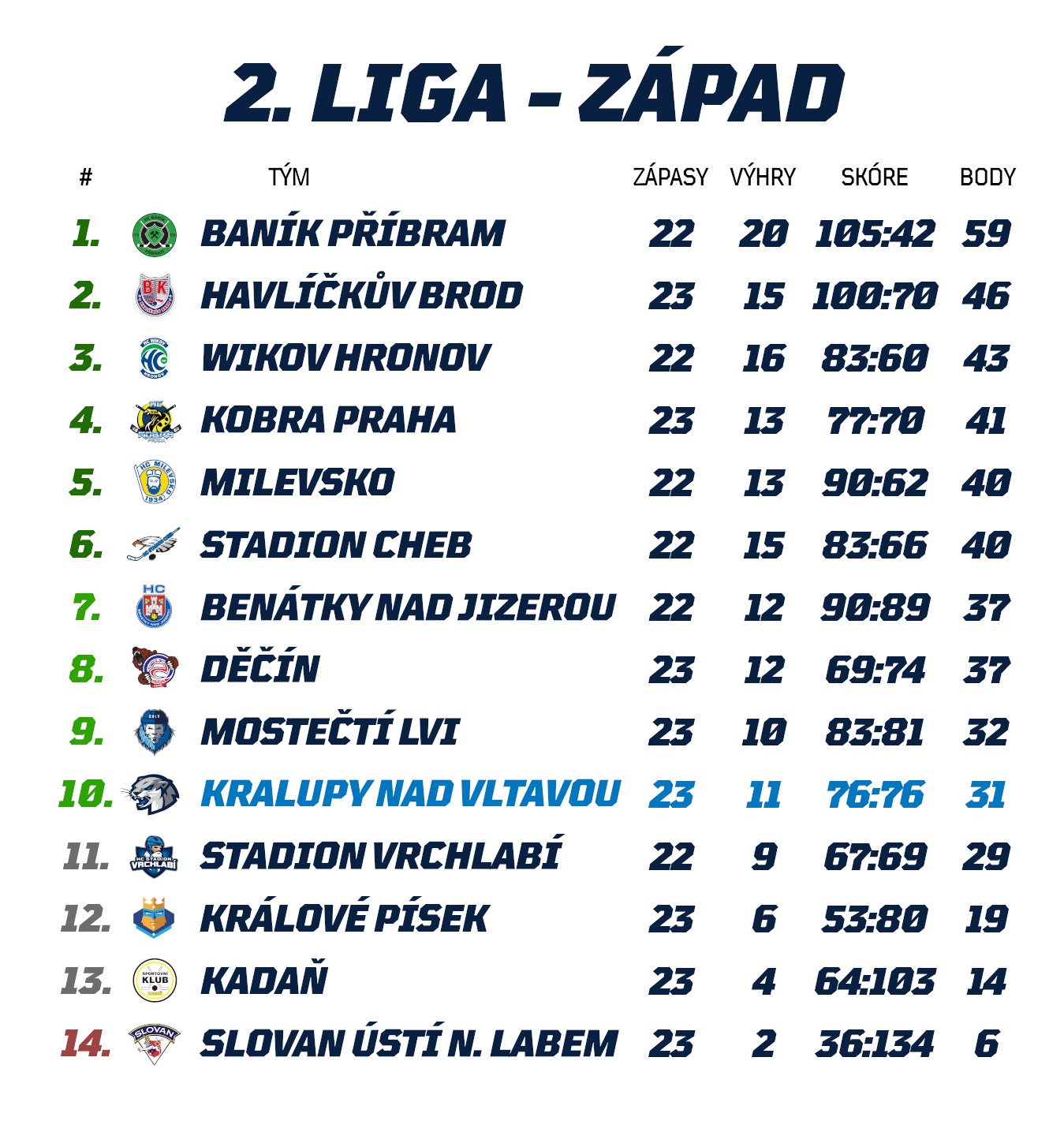 Službu k blažené spokojenosti přitom udělali Kadani v posledním středečním kole i Kralupští hokejisté, kteří z ledu posledního Ústí přivezli tříbodovou výhru a zapsali tak z pěti prosincových utkání již čtvrté vítězství. Vítězná série čítající úspěchy nad Milevskem, Děčínem Mostem a naposledy Ústí tak náš tým vrátila zpět do postupové desítky, kde aktuálně útočí na deváté místo držené s jednobodovým náskokem Mosteckými Lvy.
