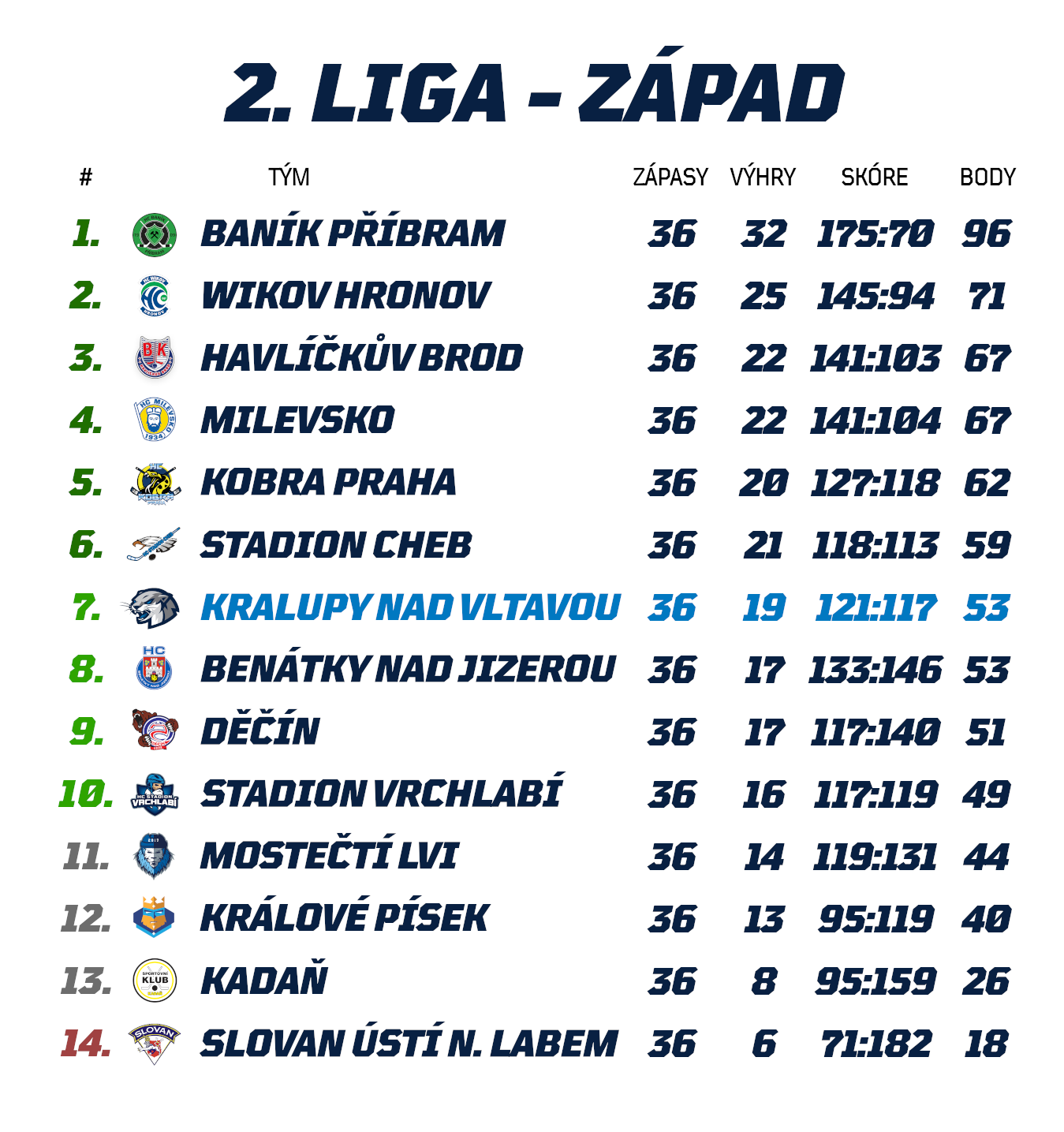Jistotu záchrany však Kadaňští přesto před sobotním kolem stále nemají. Na Ústí sice drží osmibodový náskok, ve hře je ovšem ještě bodů devět a proti našemu týmu tak budou mít pořád o co hrát. O náboj pro sobotní duel se přitom postarali sami Kralupští, když porazili ve středečním kole poslední Ústí až v prodloužení, čímž Slovanu ponechali do finiše základní části stále alespoň malou naději. Důležitým vítězstvím si přitom Kralupy nejenže samy zajistily jistotu účasti v předkola, ale stále živí reálnou šanci na elitní šestku tabulky zajišťující přímý postup do osmifinále.